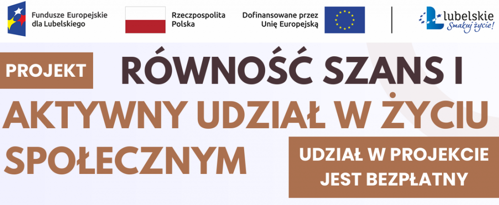 Projekt „Równość szans i aktywny udział w życiu społecznym” realizowany jest przez Wschodnią Agencję Rozwoju we współpracy (partnerstwie) z Stowarzyszenie Rozwoju Aktywności Społecznej „Triada” w okresie: 1 listopada 2023 – 31 października 2026